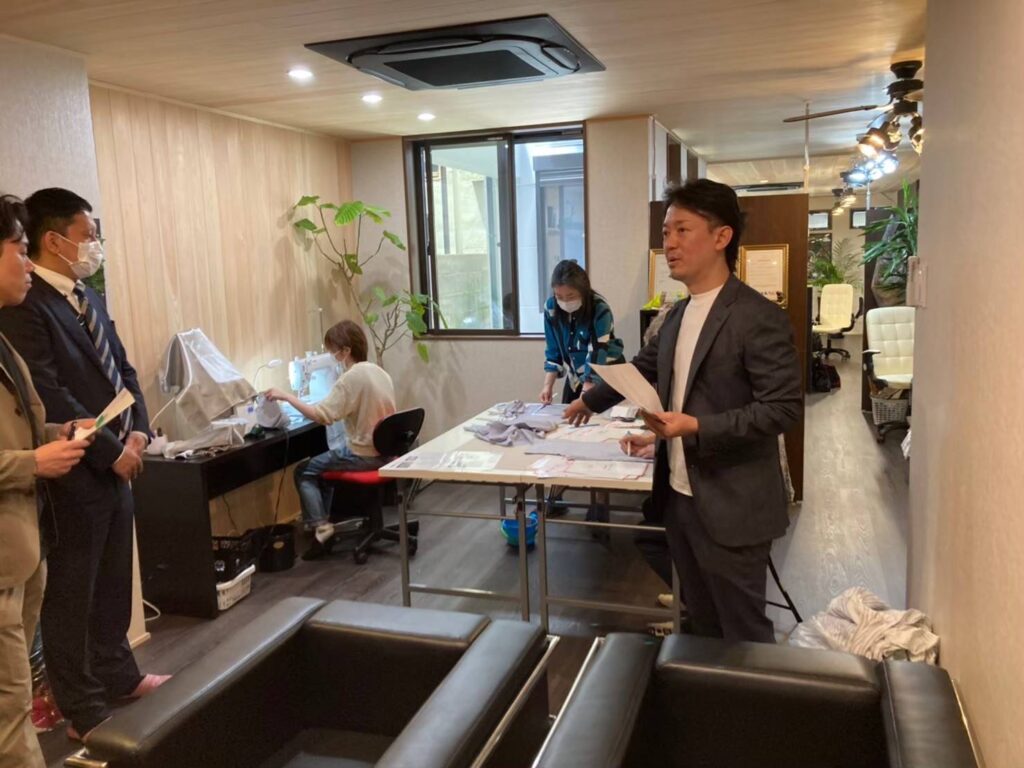 本業の派遣業と組み合わせ、派遣先の仕事の一部を切り出して A 型の仕事として請け負うことで、リフト作業の補助・清掃・伝票仕分け・お菓子の製造や梱包など、無数の業務が「障害のある方の仕事」として新たに生まれていきました。実社会に近い仕事を目指し縫製工場も立ち上げ、だんじりやお祭りの法被制作、警備制服のワッペン付けなどの受託作業にも取り組んでいます。