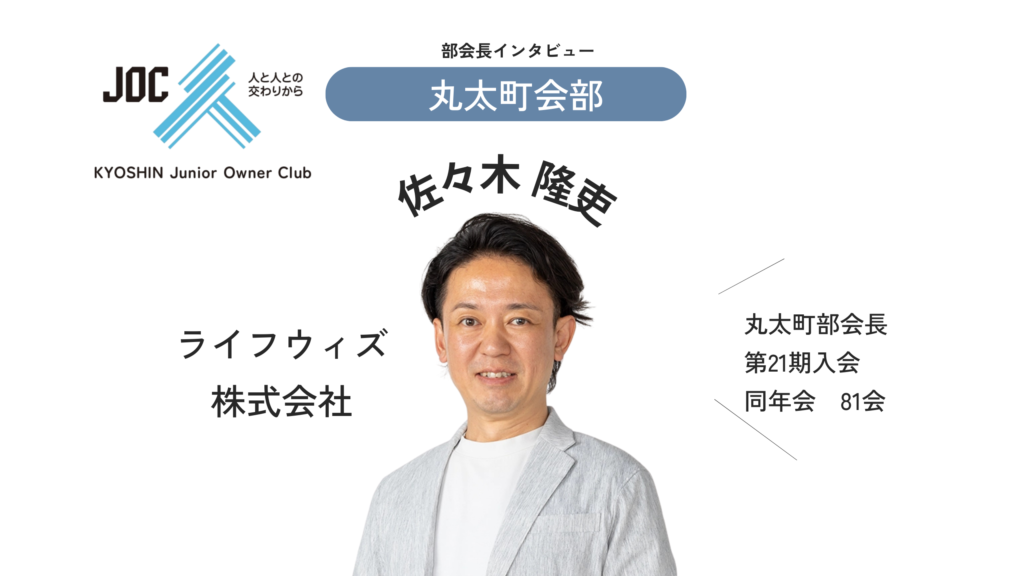 Section部会 京信JOC第24期 > 部会 > 丸太町部会 丸太町部会一覧 丸太町部会 部会長インタビュー 丸太町部会 ライフウィズ株式会社 佐々木 隆吏さん ― ―みんなが活躍すれば世界はもっと良くなる ― プロフィール