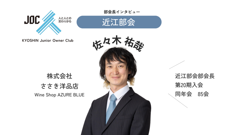 Section部会 京信JOC第24期 > 部会 > 近江部会 近江部会一覧 近江部会 部会長インタビュー 近江部会 株式会社ささき洋品店/Wine Shop AZURE BLUE 佐々木 祐哉さん ― 何