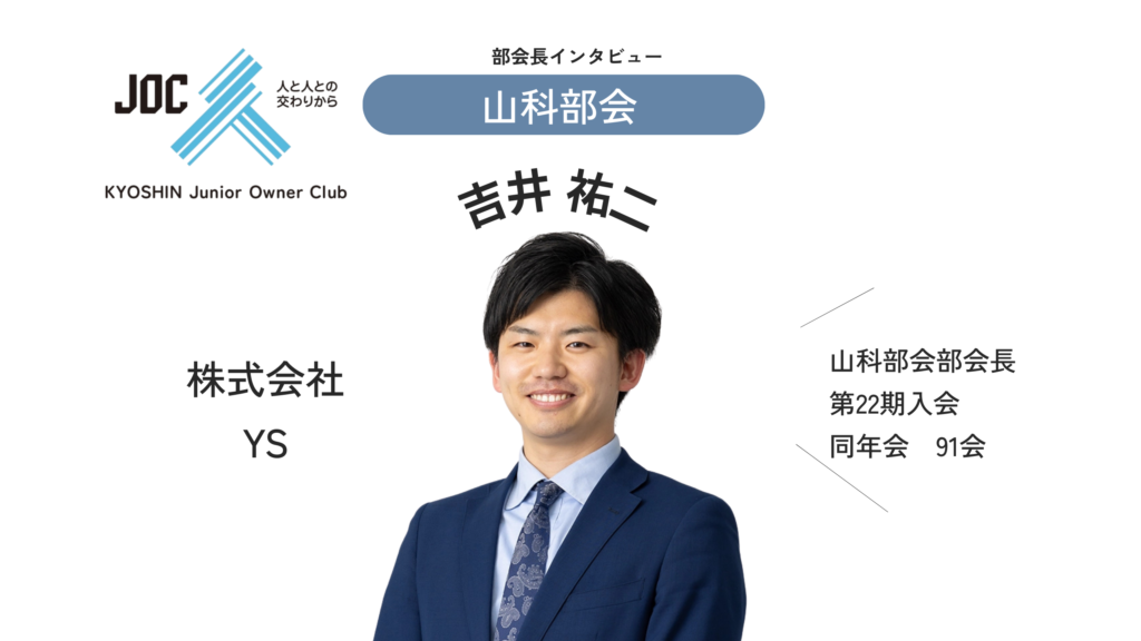 Section部会 京信JOC第24期 > 部会 > 山科部会 山科部会一覧 山科部会 部会長インタビュー 山科部会 株式会社YS 吉井 祐二さん ― 銀行で学んだ数字の厳しさ、現場で磨いた信頼、そして山科部会の未来へ ― プロフィール